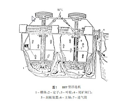 BFP型浮选机槽体上部为斜棱柱,中部为下圆上方的截头锥,下部为截头圆锥形。主轴下部的叶轮可看作是辐射状叶轮的底板边缘切去几个有双曲边的三角形而形成的,叶轮的上面是定子。